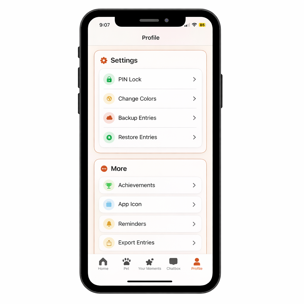 Moving MellowMe to a new phone is simple, secure, and completely private. All your mood entries, journals, voice notes, preferences, and insights transfer seamlessly while staying fully under your control. You can back up your data to iCloud, the Files app, or other storage, then restore it on your new device in just a few taps. Everything — from moods and reflections to themes and statistics — is preserved exactly as recorded, with no external servers involved. Your data stays encrypted, secure, and entirely on your devices, ensuring a smooth transition without losing your emotional history.