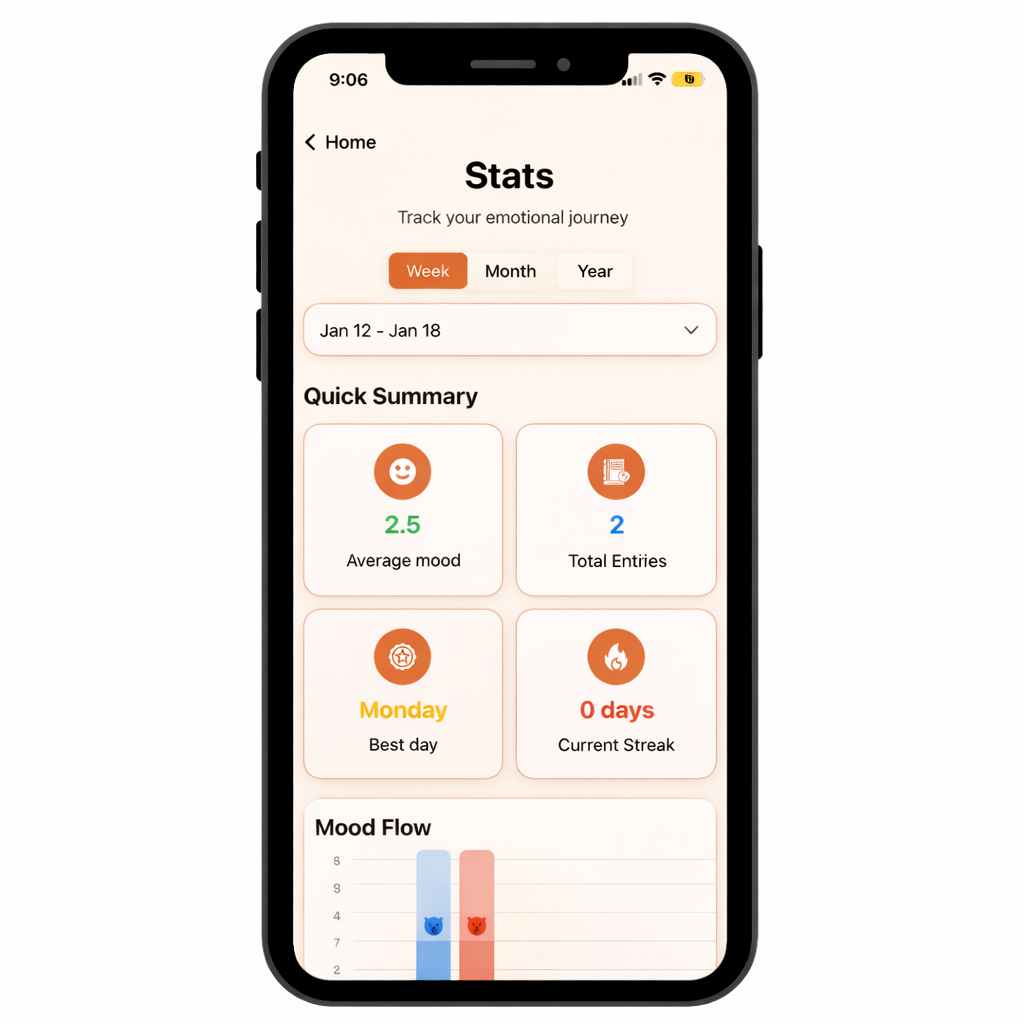 - Track moods with emoji flow (Great → Awful)
