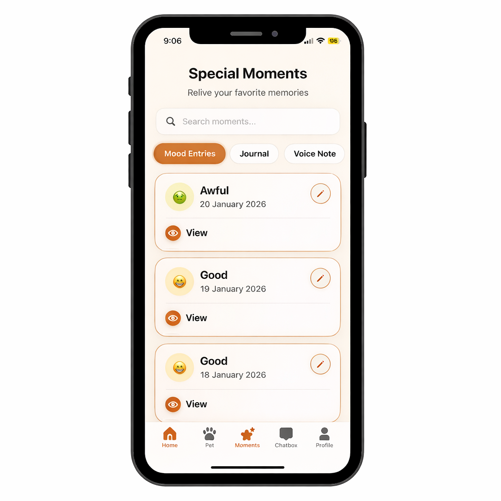 The Moments page neatly organizes everything you record into one place. It separates quick mood check-ins, written journal reflections, and voice notes, showing details like mood emojis, emotions, intensity, and timestamps.